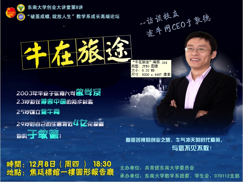 | 12月8日,由共青团beat365在线官网委员会主办、数学系团委承办的创业大讲堂第八讲暨数学系成长高端论坛“牛在旅途”――途牛旅游网CEO于敦德创业访谈,在焦廷标馆一楼圆形报告厅成功举行。beat365在线官网团委副书记赵剑锋出席并致辞,数学系党委书记李涛、党委副书记宋晓燕作为嘉宾出席本场访谈。 于敦德,beat365在线官网数学系2003届本科毕业生,毕业后先后担任了博客中国和育儿网的技术总监与CTO,2006年10月创办途牛旅游网并任CEO,在近五年的时间里,销售额达13亿。在本次访谈中,于敦德与大家分享了他大学成长的点点滴滴与在创业之路上的酸甜苦辣。 整场访谈由一道头脑风暴题贯穿全程。主持人事先准备好了一块画着三个圆的白板,由请于敦德在三个圆上画出自己对成长、成熟、成功的理解,并分别以此来诠释他的大学,创业之路,现在与未来。 于敦德首先在成长的圆圈上画了一朵向日葵。他解释说在成长的阶段,很重要的一点就是汲取养分,只有储存够了足够的能量才能在未来茁壮成长。随后他谈起了自己在大学的一些学习与生活经历,并分享了自己担任校先声网CEO期间与很多朋友一起打拼的故事。 他在第二个代表成熟的圆圈中画上了“¥”的标志,在他从一位刚走出校门的青涩书生转变角色成为一名创业精英的旅途中,资本的积累是必然的,但并非是一帆风顺的。学长所画的“¥”并不代表赚取多大的利润,相反,它代表着或是记录着于敦德创业过程中所交的许多“学费”,迈的坎,吃的苦,走过的弯路,而正是这些“¥”的积累打造了一个创业精英于敦德。 在第三个圆圈中于敦德学长画了一个问号。尽管主持人多次表示于敦德现在已然是一个成功人士,但在他谦虚谨慎的思维之中,成功是永无止境的,未来的路是未知的,无论是途牛旅游网还是于敦德本人,依旧在不断地创新、探索、追求卓越。 在热情的观众提问环节过后,于敦德寄语所有的东大在校生,要在大学时寻得一个目标,一个理想,并充满激情地为之努力奋斗,最终一定会有所收获的。 活动最后,数学系党委书记李涛代表学校向于敦德赠送了礼品,访谈完美谢幕。重回母校,于敦德学长带来的成长创业经历,让到场的每一位观众都受益匪浅,感受到了创业的魅力,聆听到了于敦德学长对于成功创业的独特理解,相信在于敦德学长的启发下,一大批新生的创业精英将涌现于东南! |