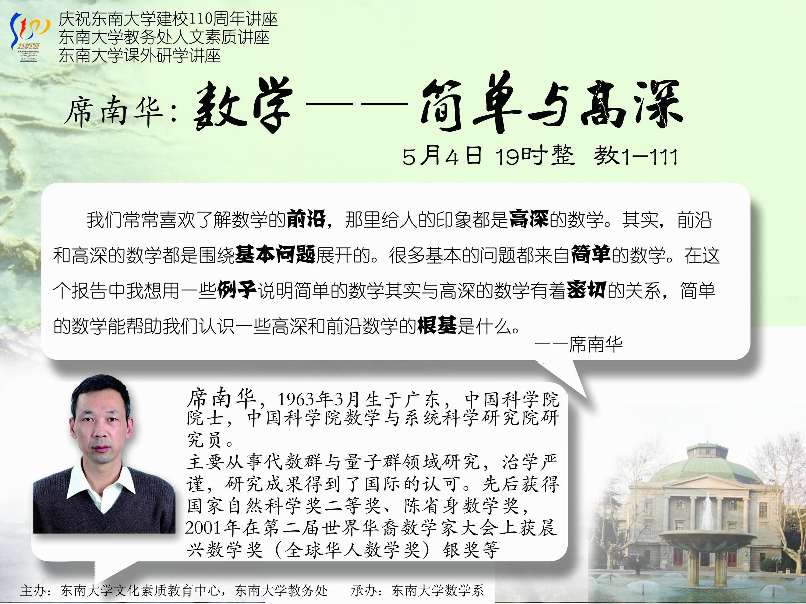 为庆祝beat365在线官网建校110周年,beat365在线官网数学系诚邀到了中国科学院院士,数学家席南华教授与东大学子分享关于数学的简单与高深。