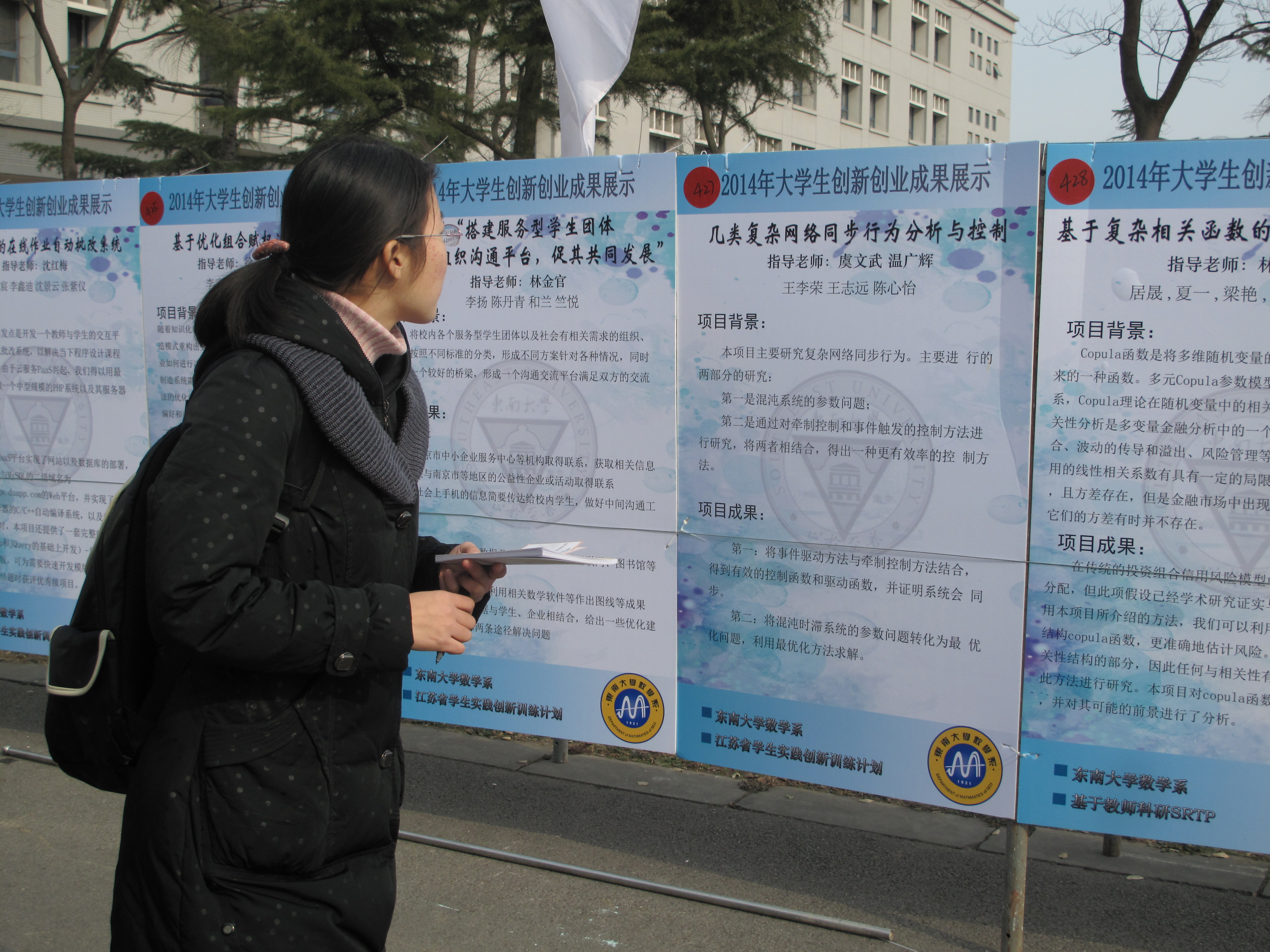 | 12月26日,beat365在线官网“第九届大学生创新创业成果展示会”在九龙湖校区如期举行。校党委副书记兼副校长刘波、副校长郑家茂、江苏省教育厅高教处副处长王兵,学校各有关部门负责同志、指导教师代表和学生代表等参加了展示会开幕式。开幕式由教务处处长雷威主持。 数学系系主任曹进德教授、党委副书记曹海燕老师、课外研学负责老师王小六老师和辅导员老师们参加了本次成果展。展示会上,数学系共展出成果展板18块,编号422-439,是近几年来展出数量最多的一年。这些展板按项目来源可以分为国创、省创、基于教师科研srtp以及校级优秀srtp。项目内容多样,有理论研究,例如陶为润小组的“偏微分方程的定性研究”;有具体应用,例如王鹏小组的“大气污染与经济发展关系的统计研究”;此外还有理论与应用,例如闫建璐小组的“二元极值模型的态密度估计及其应用”等。 展示会上,我系同学纷纷来到展示会现场驻足观看,我系自己的展板和来自全校各个院系的形式多样的成果展板或实物。展示会仪式结束后,我系党委副书记曹海燕、王小六老师、黄性芳老师、袁煜昶老师等与同学们合影留念。 据悉,本届展示会共展示作品及项目成果478件,其中实物105件,主要包括2014年已经结题验收的国家级、省级大学生创新训练计划项目,2013年和2014年基于教师科研的SRTP项目、校级SRTP项目,以及在各级各类学科竞赛中取得优秀成绩的作品等。另外,此次展示会还邀请了上海交通大学、同济大学、浙江大学、南京大学、南京航空航天大学、南京邮电大学等高校的13件优秀作品参展。展会期间,同学们现场投票评选出了“我最喜爱的20件作品”,并由专家评选出了优秀作品。 这次展示会共持续三天,既是对参展项目同学创新精神与实践能力的肯定和表扬,也是对广大学子的鞭策与激励,更将广泛、深入地推动我校本科生开展科技创新活动,希望通过展示会,点燃同学们的创新激情,激励更多的同学走上创新创业之路,成为国家社会经济发展所需要的卓越人才。 |