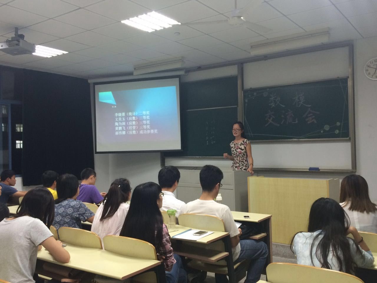 9月17日晚6:30,由数学系团委主办,数学系研究生会、2014级硕士生党支部承办的“数学建模经验交流会”在纪忠楼Y-301圆满举行。 全国研究生数学建模竞赛是面向全国在读研究生的科技竞赛活动,我系及全校每年都有多个小组参加并取得优异成绩。本次交流会邀请了去年参赛获奖的五名同学出席,并与即将参加的建模比赛的同学们分享了他们宝贵的经验,让同学们对比赛有更全面的认识并提前做好规划准备。 出席本次交流会的五位同学分别是获得二等奖的李晓蓉,获得二等奖的陶为润,获得三等奖的文美玉,获得三等奖的黄鹏飞,获得成功参赛奖的王强。在主持人简单介绍了他们给大家认识之后,五位学长学姐便依次上台从小组成员的选择及分工、时间安排、选题、论文写作、与本科生建模比赛差异等方面分享了自己在参赛过程中的心得和感受。 在五位学长学姐分享经验的过程中,台下的同学也始终保持着认真聆听的状态,记录着各位分享的参赛注意事项。在接下来的提问交流环节中,学长学姐们耐心地解答了大家对于建模大赛的种种疑问,同时也对之前的一些想法进行了补充。 最后活动在同学们对学长学姐感谢的掌声中圆满结束。本次交流会一方面让大家对建模大赛有了更深的了解,另一方面也让大家看到自己在准备工作上的不足。数学系研会衷心祝愿所有参与建模大赛的同学能够取得好成绩,也祝愿学长学姐们能够越走越远! (通讯员:卢珊、李玉芳) |