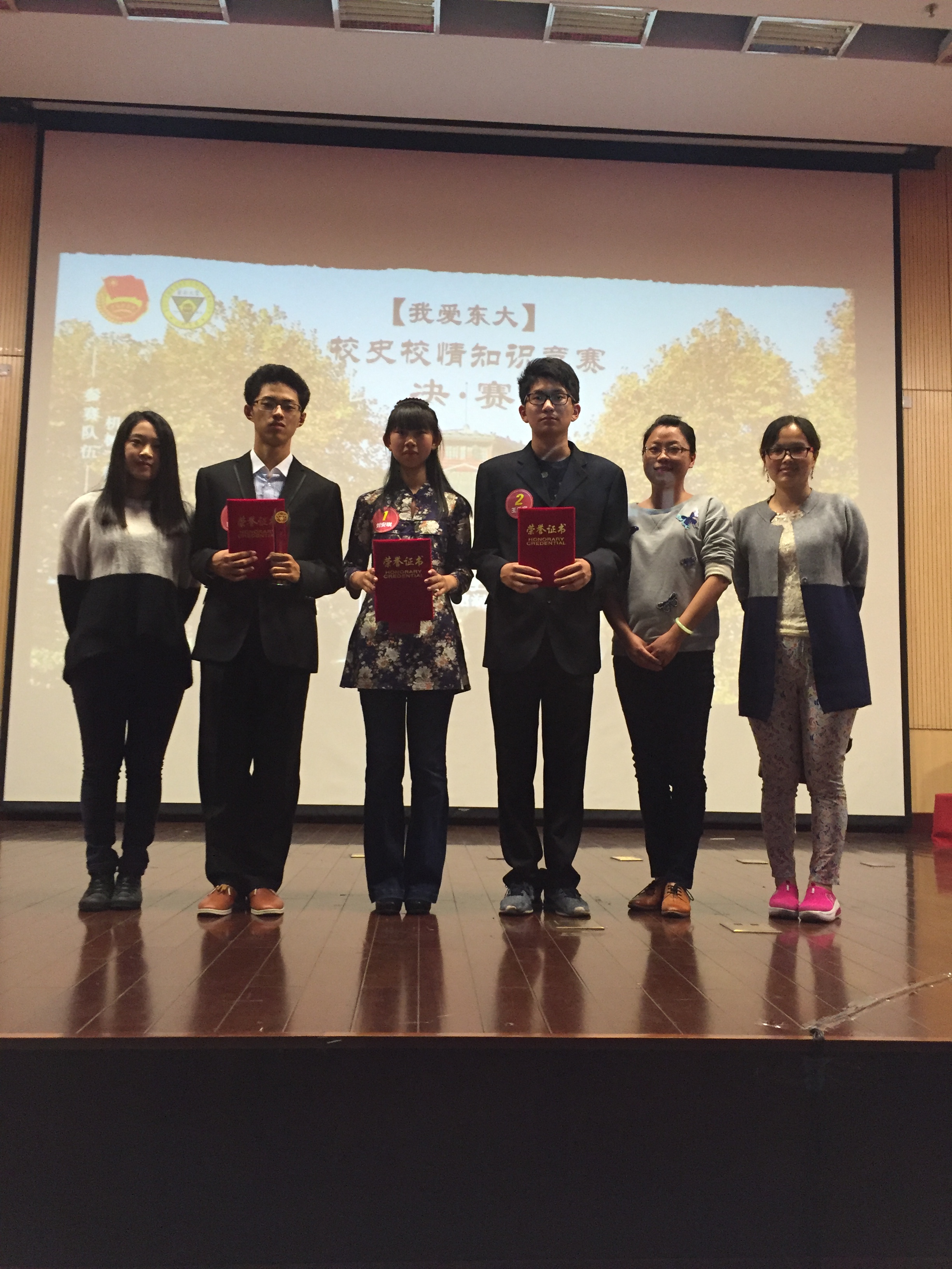 10月29日晚六点,“我爱东大”第十二届校情校史知识竞赛决赛在图书馆润良报告厅隆重举办。来自数学系15级的王乔宇、周晓、刘安琪同学代表我系参加了本次决赛,并最终斩获二等奖的喜人成绩! |