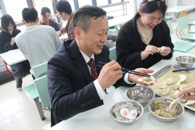 活动在欢快、祥和的气氛中进行,主持人路嘉伟向郑家茂副书记介绍了班级和同学情况,郑书记坐在同学们中间与大家一起包饺子,亲切地分享自己包饺子经验,伴随着热腾腾的饺子,同学们与郑书记边吃边聊,郑书记为同学们讲述自己学习与成长经历。