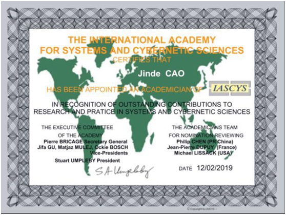 近日,我校曹进德教授当选国际系统与控制科学院院士 (Academician of the International Academy for Systems and Cybernetic Sciences,简称IASCYS院士),以表彰其在系统和控制科学的研究和实践中的杰出贡献。