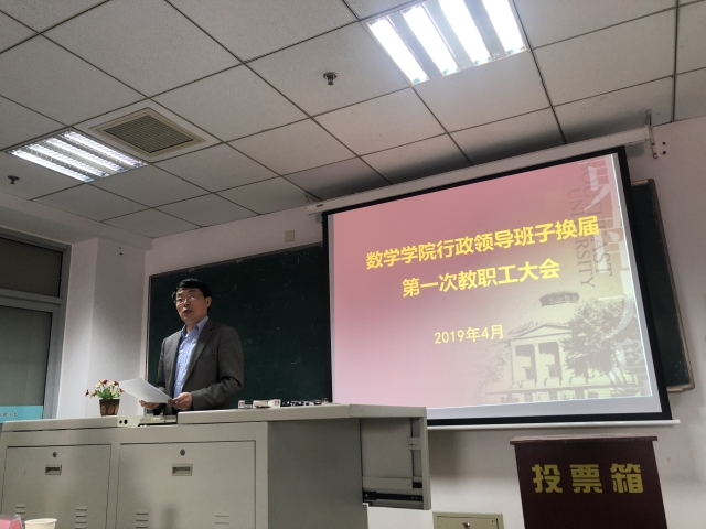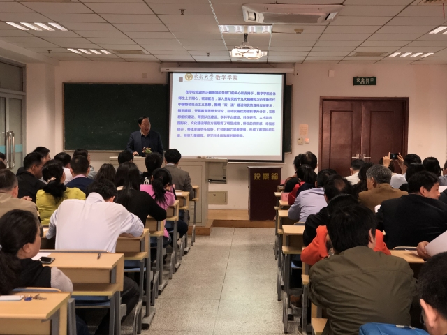 随后,学院院长曹进德教授代表班子作述职述廉报告。曹院长回顾了现任领导班子任职近五年来学院在立德树人、师资建设、学科建设、人才培养、国际化、文化建设以及党风廉政建设等方面所取得的成绩,并对新一届班子在加大人才引培力度、协调二级学科均衡发展、全面启动优势理科攀升计划、打造国家级平台、提高师生国际化水平和建立完善院系模式治理结构等方面提出了建议,曹院长指出,学院各项成绩取得来之不易,离不开学院党委和全院教职工的奋力拼搏,建设双一流大学任重道远,学院仍需砥砺前行,感谢为学院发展做出贡献的每一位数学人!
