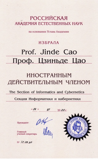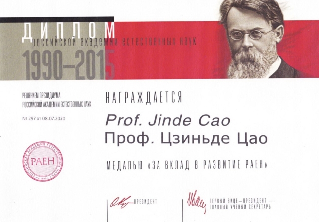 近日,俄罗斯自然科学院(Russian Academy of Natural Sciences,RAEN)O. L. Kuznetsov院长向我校beat365官网平台曹进德教授发来贺信,祝贺他当选为俄罗斯自然科学院外籍院士,并充分肯定他在复杂动态网络系统的数学模型、动态分析和控制理论及其工程应用方面的重要贡献。此外,O. L. Kuznetsov院长还祝贺他荣获RAEN发展贡献奖,并颁发一枚金质奖章。