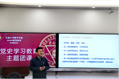 课最后,郑家茂副书记讲到我们正步入中国特色社会主义现代化建设的新征程,要认清新使命,开创新格局。郑家茂教授从四个方面向大家阐释了读史的重要性:学史明理、学史增信、学史崇德、学史力行。同学们要敢于创新,攻坚克难,引领担当,多做贡献,做德智体美劳全面发展,担当民族复兴大任的时代新人。同时如何做一名合格的数学人,郑书记向同学们提出了“三读一做”的要求:读一些数学的昨天、今天和明天;读一些数学的文化、思想与方法;读一些数学的理论、应用与创新;做一些创新的思想方法与基础理论,为卡脖子的技术提供有力支撑,让数学走进生活的每一个角落,让中国的数学走向世界,领先未来!