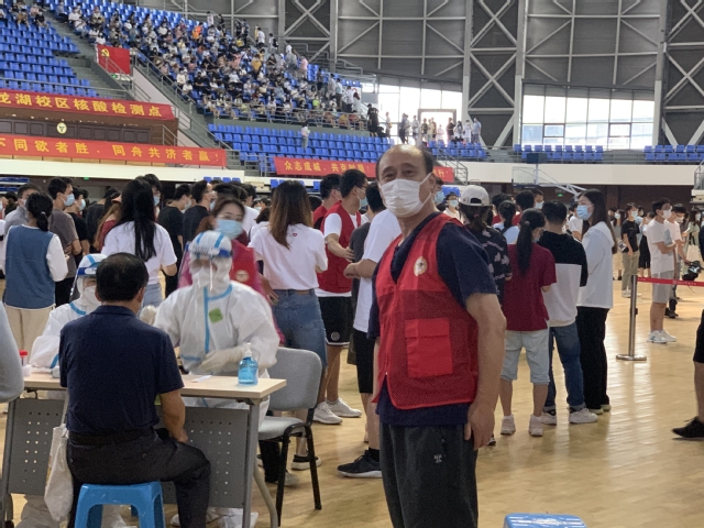 beat365官网平台机关严昌强老师,还有两个月即将退休,在看到学校招募志愿的通知后,第一个报名,主动请缨,挺身而出为九龙湖校区全员核酸检测采样工作保驾护航。早上7点,严老师就从市区赶到九龙湖校区为核酸检测做准备,在九龙湖体育馆,严老师是全场年龄最大的志愿者,他用顽强的毅力,无私的付出,坚守了整整五个小时,负责维护教师采样队伍的秩序,引导教师有序排队,保证安全畅通,严老师为保障核酸检测采样工作顺利进行,贡献自己的绵薄之力。