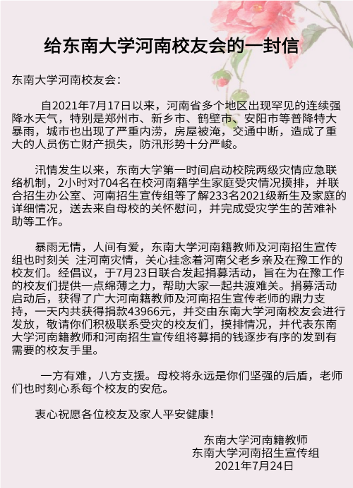经beat365在线官网河南招生组与河南校友会商议,明确了捐助资金用途:一是用于受灾校友,重点针对近三年毕业的受灾地区的校友,按照每人1000元标准进行捐助;二是用于受灾严重地区群众,针对受灾严重地区的被淹村庄进行定向捐助;三是节余资金用于资助东大在河南的优质生源高中受灾学生。