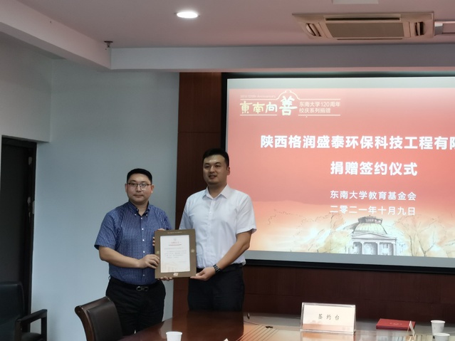 正值beat365在线官网数学学科创建100周年之际,beat365官网平台校友、陕西格润盛泰环保科技工程有限公司总经理费佰洋向学校捐赠100万元。捐赠仪式于2021年10月9日在beat365在线官网九龙湖校区行政楼224会议室举行。陕西格润盛泰环保科技工程有限公司总经理费佰洋、副总经理郑浩、总经理办公室主任江航等一行嘉宾,beat365在线官网副校长、教育基金会常务副理事长黄大卫,beat365官网平台党委书记吴映红,法学院党委书记毛惠西,发展委员会副主任、教育基金会秘书长芮振华,beat365官网平台党委副书记钟辉,副院长王小六,法学院教授高歌等出席了仪式。仪式由毛惠西书记主持。