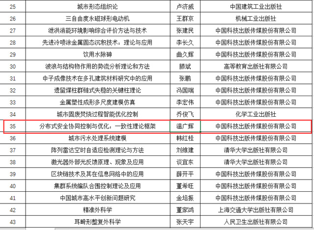 近期,国家科学技术学术著作出版基金委员会公布了2022年度国家科学技术学术著作出版基金资助项目。我院温广辉,付俊杰、吕跃祖、万颖四位老师依托科学出版社拟出版的学术著作分布式安全协同控制与优化:一致性理论框架”获得资助,这是我院自2015年虞文武、温广辉、曹进德教授首次获得该国家级出版基金资助以来第2次获得资助。本次全国共有198部著作获得国家科学技术学术著作出版基金项目资助。