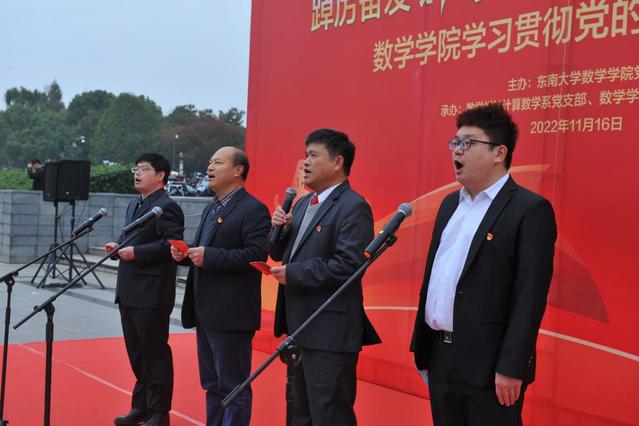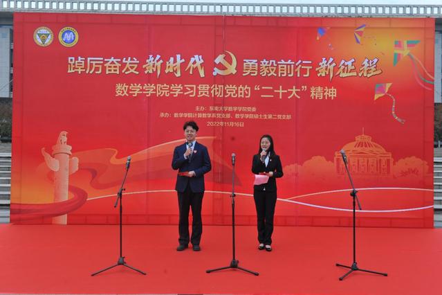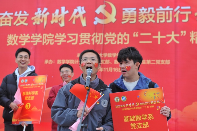 为了认真学习贯彻党的二十大精神,全面理解、准确把握党的二十大精神的丰富内涵、思想精髓、核心要义和实践要求,认真领悟党的二十大提出的新思想新论断、作出的新部署新要求,深刻领悟“两个确立”的决定性意义,激励党员不忘初心、牢记使命,推动我院快速发展,助力我校“双一流”建设。beat365官网平台全体师生党员于2022年11月16日在九龙湖校区李文正图书馆前开展“踔厉奋发新时代,勇毅前行新征程”学习贯彻党的二十大精神主题活动。本次活动由beat365官网平台教授陈建龙老师,2021级硕士生肖靖婕和路嘉伟主持。