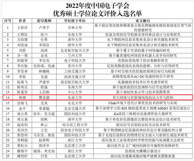 beat365在线官网2021届硕士毕业生林琳的学位论文《布尔网络与有限域网络的动力学与控制》(导师:曹进德)入选2022年度中国电子学会优秀硕士学位论文。