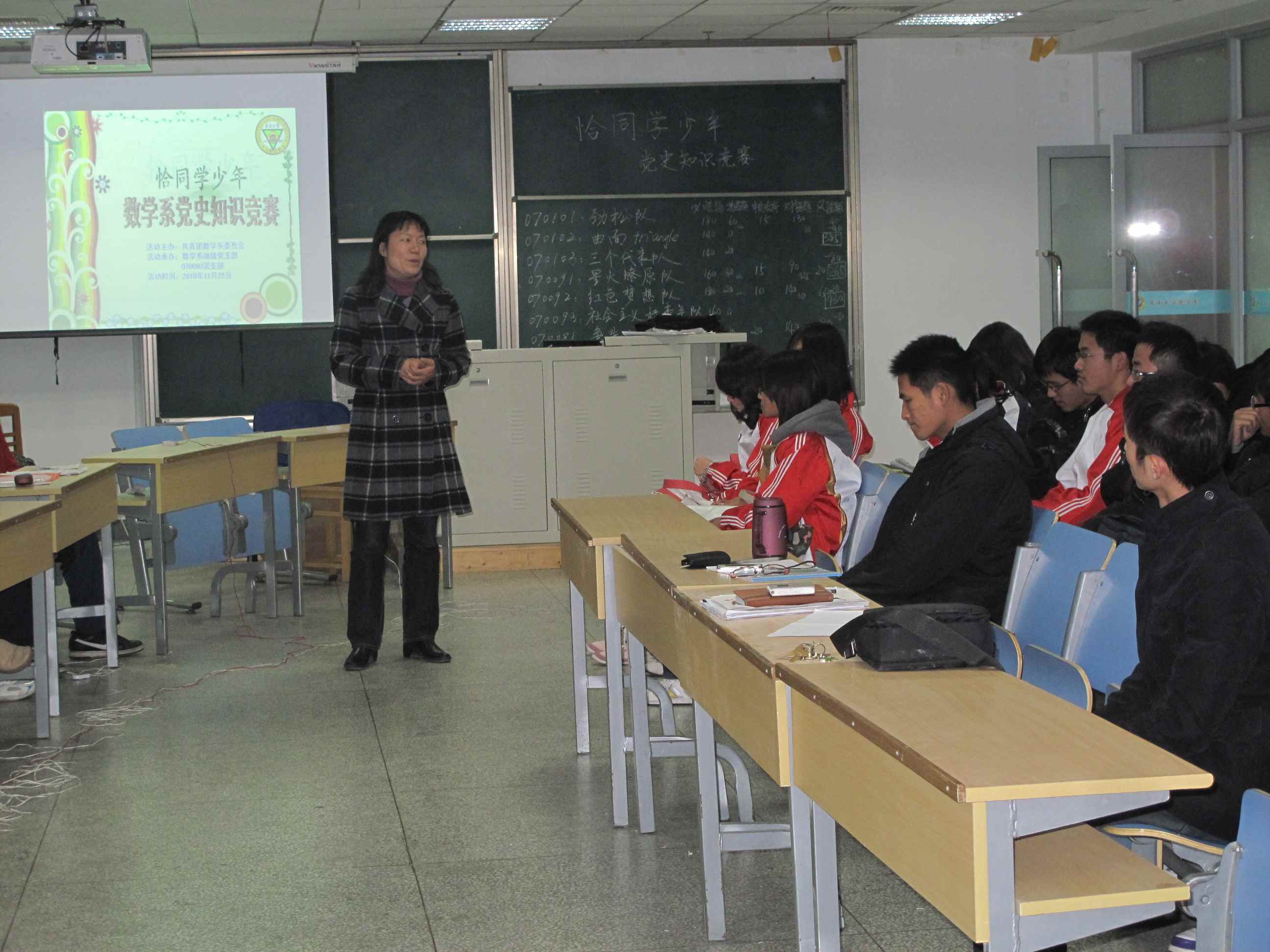 11月25日晚,数学系首届“恰同学少年”党史知识竞赛在图书馆数学系第二报告厅揭开了帷幕,尽管初冬的天气阴冷,但却无法抵挡同学们如火的热情,大厅里暖意融融。数学系党委书记宋晓燕,团委书记袁煜昶以及张涌教师也应邀出席。 在一段幽默诙谐的暖场视频后,比赛正式开始。参加比赛的是来自各个年级的入党积极分子,他们以支部为单位,共组成了8支代表队参与角逐。比赛由必答题、抢答题、判断题、风险题四部分组成。经过必答题和抢答题的紧张较量,有4支代表队顺利进入下一轮。 中场休息环节,四名代表分别介绍了党的先进分子事迹,同学们深深为党员的先进事迹所感染,他们热情的脸庞、坚毅的眼神,体现了他们向党的决心。 第三环节判断题过后,四队仍难分伯仲。比赛进入了最具戏剧性和挑战性的风险题环节,全场的气氛也达到了紧张的顶点,高得分伴随的高风险给比赛带来了极大的不确定性因素,结果,10级1班同学功败垂成,最后一题上的犹豫使他们与胜利擦肩而过。 最终,070092支部凭借稳健的发挥拔头筹。虽然比赛有输赢,但通过这次竞赛,同学们对我们党的历史和章程有了更深刻的理解,也很大程度上激发了大家的入党热情,而这正是本次比赛的宗旨所在。恰同学少年,风华正茂。相信比赛一定会越办越好,越来越多的风华青年将为党奋斗无悔青春! |
