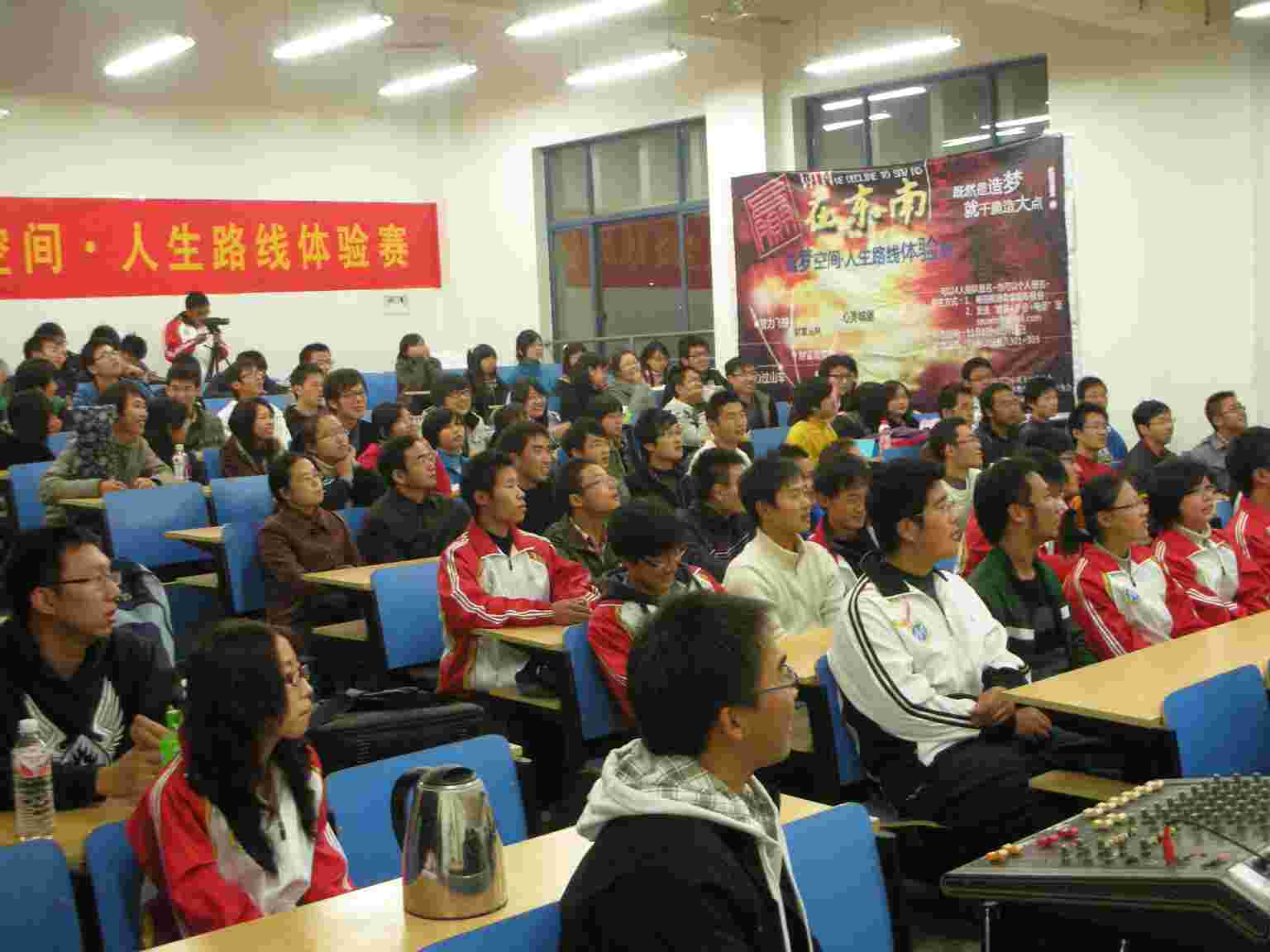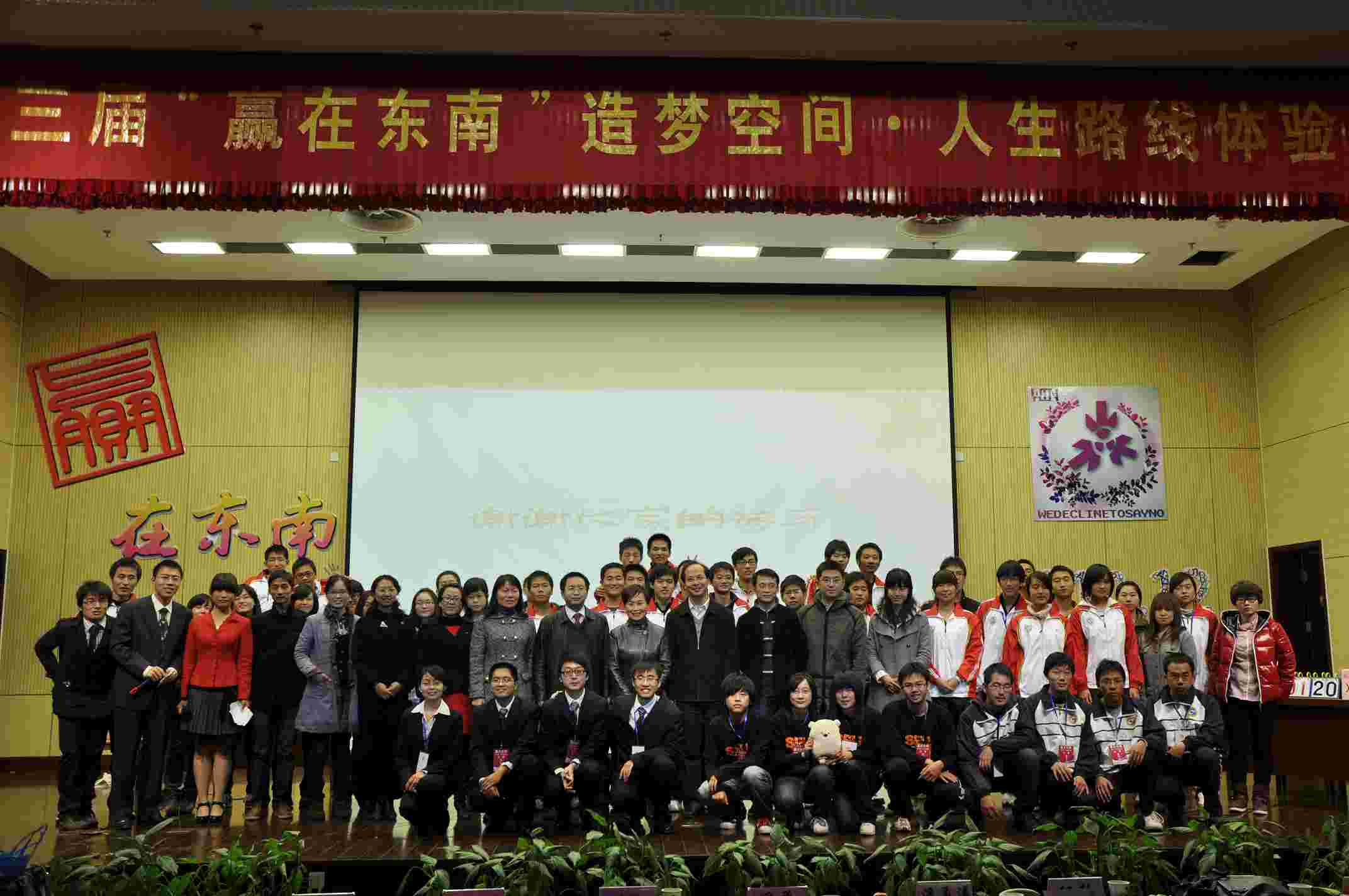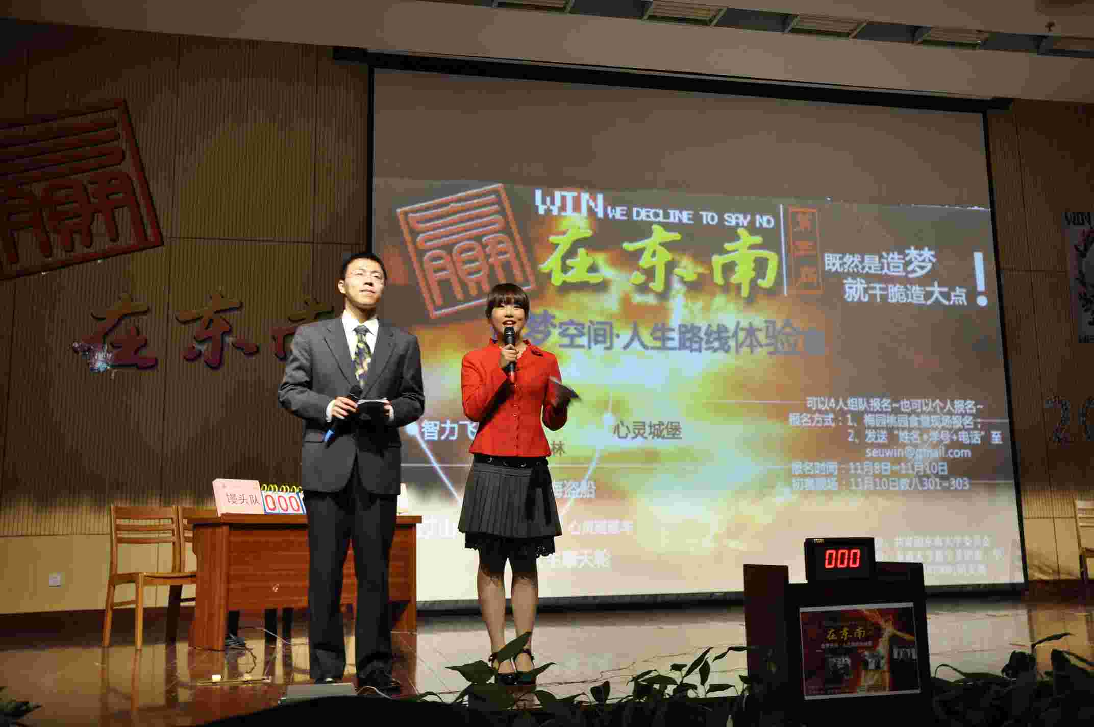 “赢在东南”造梦空间•人生路线体验赛,以体验人生,实现梦想为宗旨,分初赛、复赛、决赛三个环节,每个环节都贯穿智力人生、财富人生、情感人生三条路线的体验。初赛“人生摩天轮”于11月10日、11日晚在教室以笔试形式举行,吸引了来自各院系的100多支队伍近600人参加。复赛由“智力过山车”“心灵碰碰车”“财富海盗船”三个环节组成,分别从智慧、情感、财富三方面考察选手的能力,如何使鸡蛋从高处掉落而不碎的比拼,新街口一支玫瑰花可以展开哪些奇思妙想的营销竞赛,以及各队一场真情告白的视频拍摄,多种形式,充满挑战,充满激情。