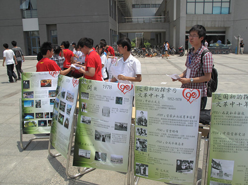 由共青团beat365在线官网委员会主办,beat365在线官网数学系团委承办的“品赤色年华,行大爱无疆”纪念建党90周年活动,于2011年5月18日中午在大活广场举行。活动通过营造红色氛围,让当代大学生在感恩伟大的党和祖国的同时,奉献爱心,回报社会。本次活动得到了广大师生的广泛欢迎和支持,共有师生500余人次参与进来,同时通过江苏省慈善总会为贫困儿童义卖募捐到635.5元。 活动主要有爱心义卖、年代照片、有奖问答三个板块。爱心义卖,通过购买红色物品奉献爱心。活动中,我们义卖了雷锋玩偶、搪瓷杯、毛主席徽章、革命主题的本子等物品,很受大家欢迎,在短短的一个小时内,全部被大家买走,共获得善款635.5元。同时,我们还精心设计准备了一个爱心纪念册,大家在上面也写满了对贫困儿童的关爱与期望。后期我们将会把善款通过江苏省慈善总会捐赠给贫困儿童。 年代照片,同学们换上不同年代的衣服在不同的背景前拍照。有的同学穿上红军装,在毛主席像面前感受那段历史,回味长征的艰辛;有的同学一起穿上绿军装,在天安门前面找寻革命年代的青春与激昂;有的同学穿上中山装、女学生装,在老上海寻味那个时期学生的朝气蓬勃。也有同学在我们设计的华表、实际比例的坦克前拍照留恋。年代照片仿佛让大家穿越到一个个不同的年代,感受着我党90年的风雨历程。 有奖问答,同学在欣赏我们制作的展板后,有奖回答我们的问题。很多的同学在欣赏这些趣味性的展板后,回答了诸如红军长征经历了祖国14个省,中国的第一家麦当劳是在深圳开业等题目后,欣喜的得到毛主席徽章、红色主题卡贴等小礼品。让大家在欣赏我党90年变迁的过程中,感受党的伟大,同时收获我们赠送的小礼品。 此次活动在轻松愉悦的氛围中进行,让大家在趣味的有奖问答中了解党的历史,在欢乐的年代照片中感悟党的精神,在怀旧的爱心义卖中回馈党的恩情。活动在广大师生的广泛参与下获得了圆满的成功。让建党90周年的氛围在beat365在线官网更为浓烈。我们相信,我们的明天在党在领导下会更加美好! |